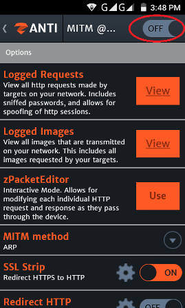 Step3; You will see that when the man in the middle attack screen will open, click on the MITM to turn it on.