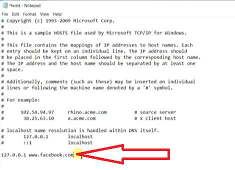 STEP3; Next, open the file with notepad at the bottom create a new line then type 127.0.0.1 space the website address, you want to block for example- if you want to block Facebook website. Type the below string👇
