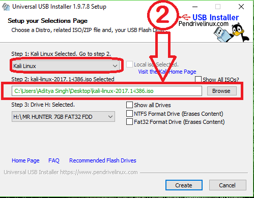 Step6; After selecting the kali linux , In the second step give the location of the kali linux’s iso image where you have downloaded the kali linux’s iso file.