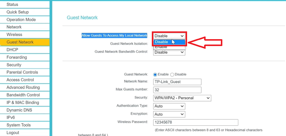 STEP:6) Make sure that allow guests to access the local network is disabled. So, that guests won’t be able to see your shared files and other information on your primary network.