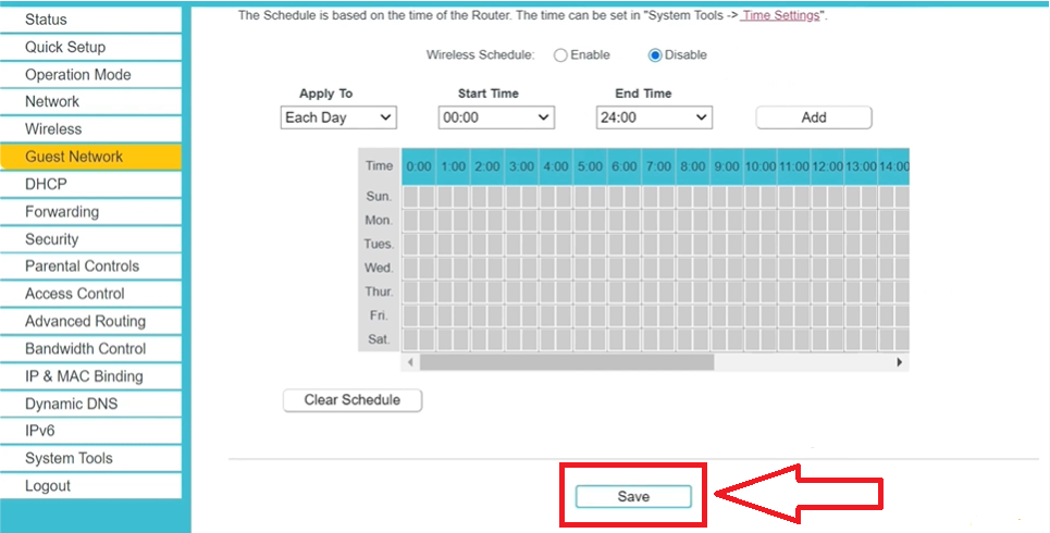 STEP:8) You can also set a specific time for guests to be able to access the internet, and click on the Save button.