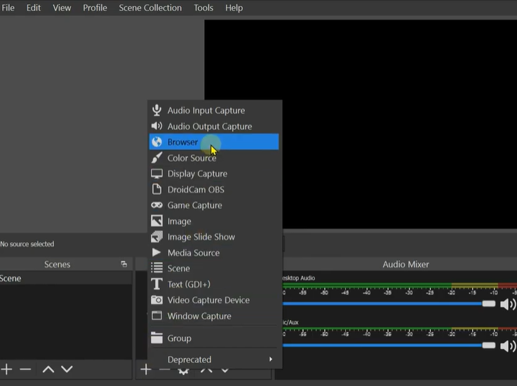 STEP4: Next on your computer open obs studio click on the plus icon to add a new source and select browser.