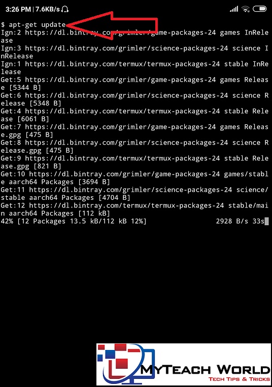 STEP4; Now you have to open TERMUX application After that you have to update TERMUX by typing “apt-get update” command. As you have seen the update has started as soon as you open its display will look something like this.