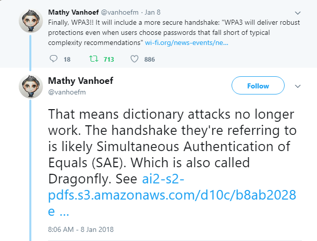 According to Mathy Vanhoef, a network security and applied cryptography post-doctoral candidate and one of the researchers behind the WPA2 KRACK vulnerability which took advantage of the WPA2 uses a four-way handshake that ensures the same password is being used by both clients and access points when they join a Wi-Fi network. WPA3 standard will use a new handshake, which won’t be vulnerable to dictionary attacks. Further, WPA3 will also feature a 192-bit security suite aligned with the Commercial National Security Algorithm (CNSA) Suite that will protect government, defense, and industrial networks that have higher security requirements. The new security features will be available later in 2018.